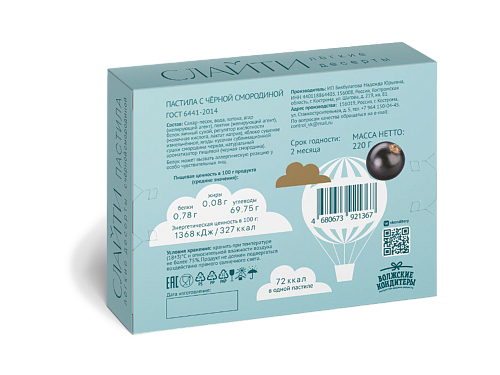 сахар-песок, вода, патока, агар (желирующий агент), пектин (желирующий агент), белок яичный сухой, регуляторы кислотности (молочная кислота, лактат натрия), яблоко сушеное измельченное, ягоды кусочки сублимационной сушки смородина черная, натуральный ароматизатор пищевой (черная смородина). Упаковка и фасовка: