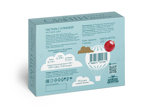 Сахар-песок, вода, патока, агар (желирующий агент), пектин (желирующий агент), белок яичный сухой, регуляторы кислотности (молочная кислота, лактат натрия), яблоко сушеное измельченное, ягоды кусочки сублимационной сушки клюква, натуральный ароматизатор пищевой (клюква). Упаковка и фасовка: