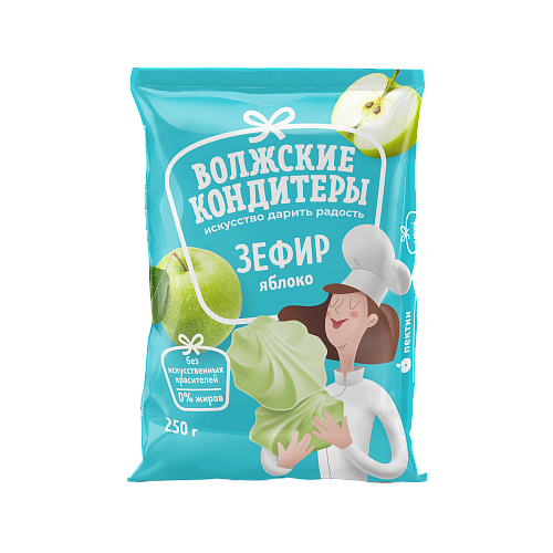 Зефир "Яблоко" ГОСТ 6441-2014 Сахар-песок, вода, патока, пектин (желирующий агент), белок яичный сухой, регулятор кислотности (молочная кислота, лактат натрия), яблоко сушеное измельчённое, ароматизатор пищевой (зелёное яблоко), краситель пищевой (михромовый зеленый). Упаковка и фасовка: